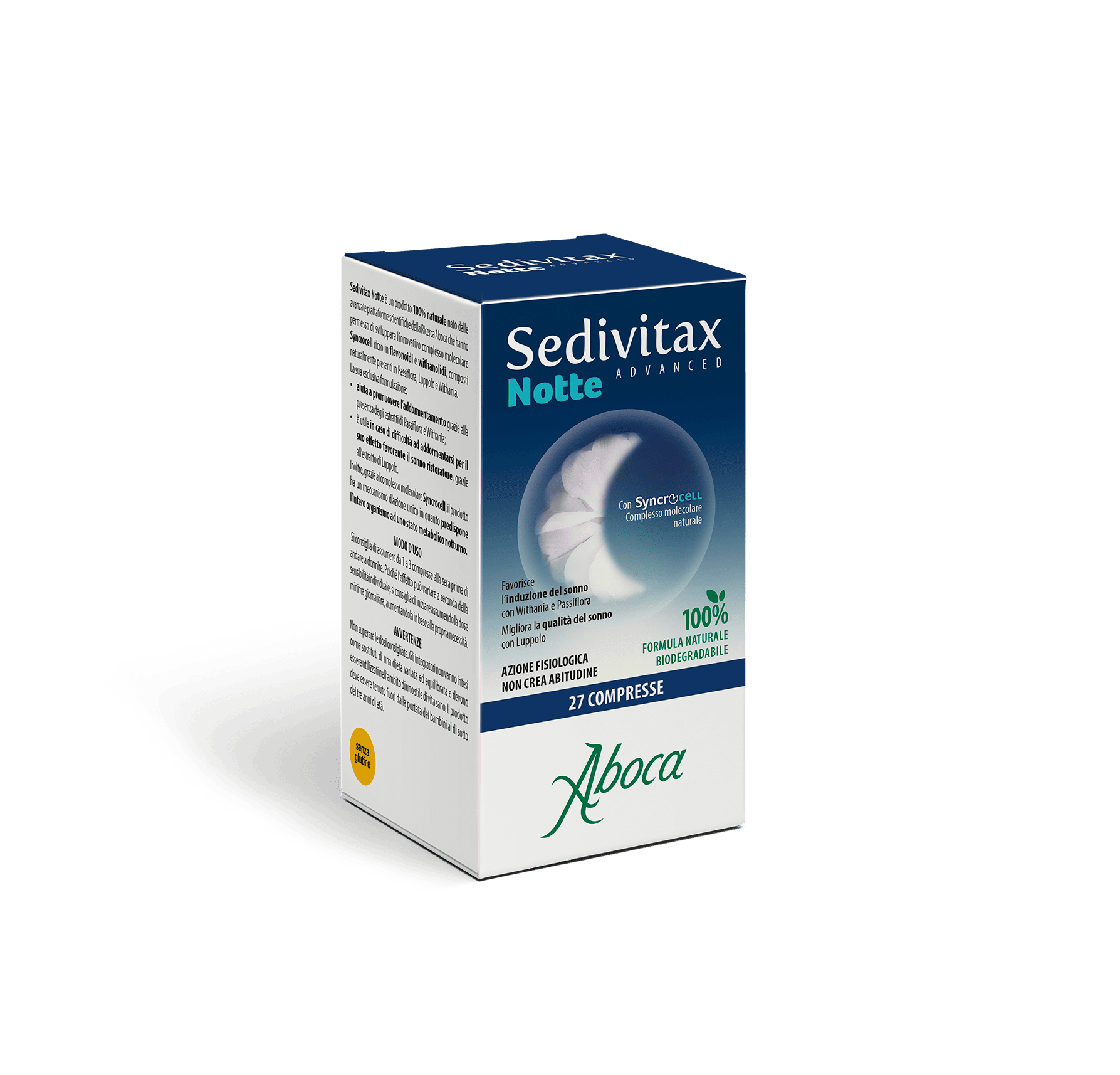 Sedivitax Notte Advanced è un integratore alimentare 100% naturale e biodegradabile , sviluppato per favorire l'induzione del sonno con Passiflora e Withania , oltre che a migliorare la qualità del sonno grazie al Luppolo .